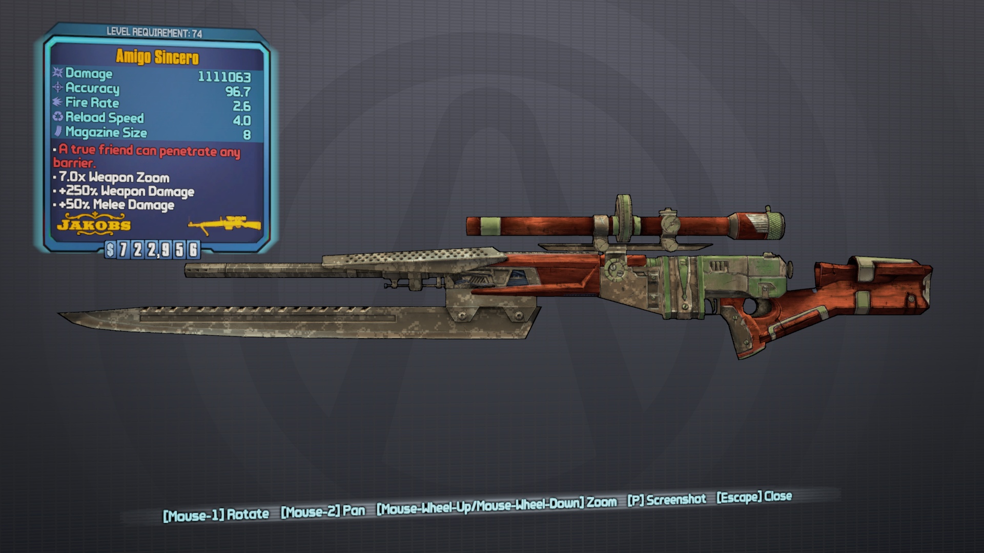 Increased damage. Reduced fire rate. Fixed scope and melee attachment.
